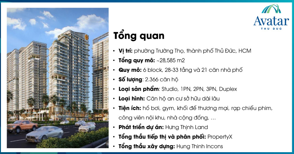 Dự án Avatar Thủ Đức tọa lạc trên tuyến đường trọng điểm Vành Đai 2 thuộc địa phận phường Trường Thọ, Thủ Đức, TP. HCM, đây là khu vực năng động, kinh tế phát triển nhộn nhịp tại khu Đông. Dự án có quy mô khu đất khoảng 28.585m2 với 6 Block căn hộ cao 33 tầng, với khoảng 2.366 căn hộ & trung tâm thương mại, trường học, công trình công cộng, công viên.